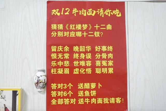 因臨近“雙十二”,一家面館的優(yōu)惠活動竟然是答有關(guān)《紅樓夢》的題,答對即可獲得相應(yīng)的優(yōu)惠,這場別出心裁的活動,自然吸引了不少人的關(guān)注??吹贸鰜砻骛^老板是一位忠實的《紅樓夢》粉絲,而且老板還是一位80年代的浙大文學(xué)碩士,看老板出的題,你能答對幾個呢?