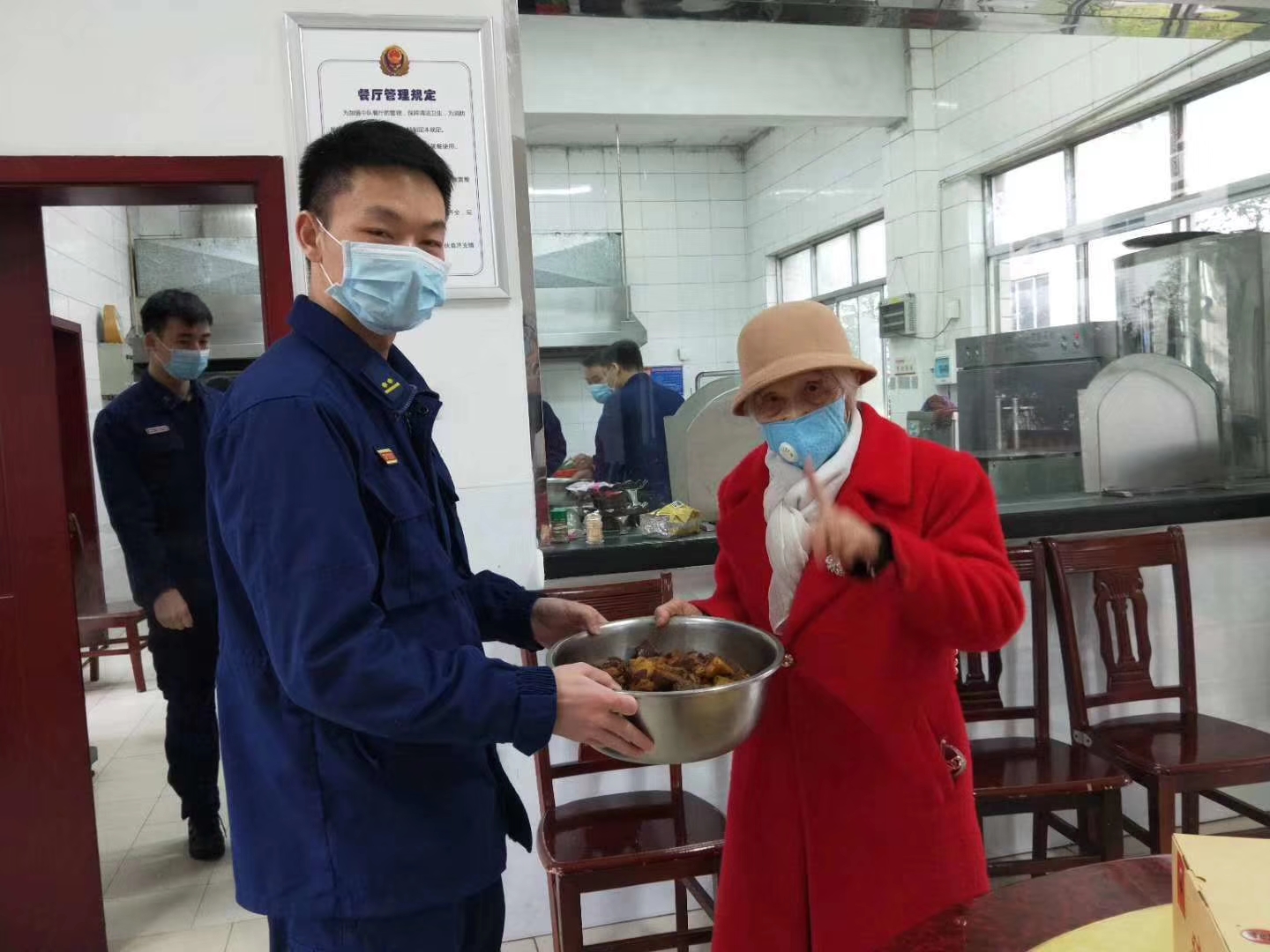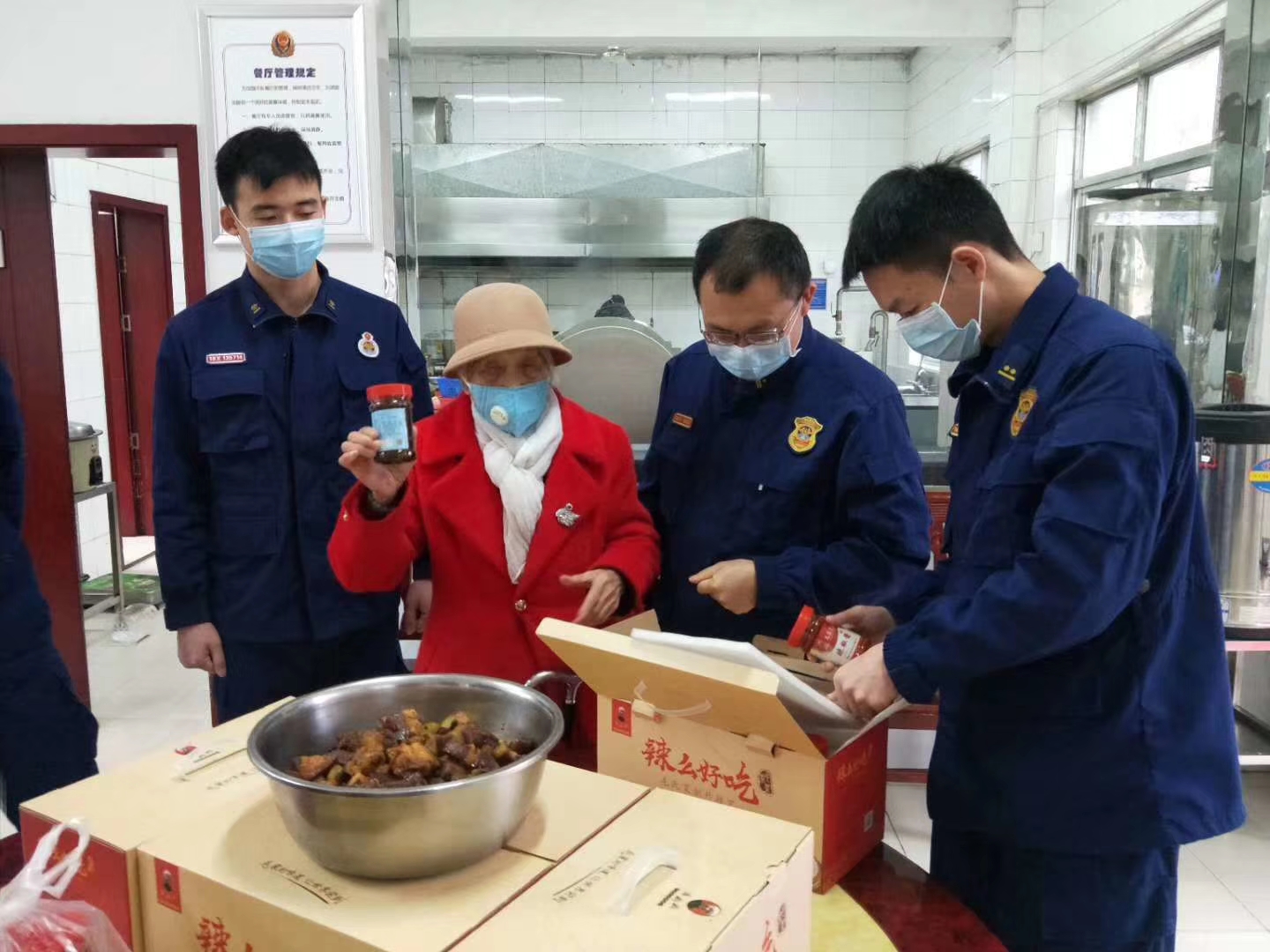 3月3日,得知大隊指戰(zhàn)員全員在崗忙于抗“疫”,沒有一人休息時,今年已經(jīng)90歲高齡的全國愛國擁軍模范、第三屆全國119消防獎先進個人湯瑞仁奶奶一大早起床,親自掌勺、精心烹飪了一大鍋毛家紅燒肉,并在員工的陪同下將香噴噴、熱騰騰的紅燒肉及毛家食品送到了消防大隊。