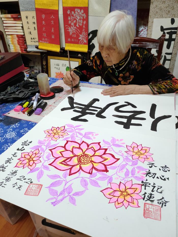畫畫只是湯奶奶眾多的興趣愛好之一,練習(xí)書法也是湯奶奶的愛好。在青年時(shí)期,由于環(huán)境落后,當(dāng)時(shí)的湯奶奶沒有上過學(xué),也不會(huì)寫字。但是現(xiàn)在湯奶奶不僅會(huì)寫字,還練得了一手好書法。湯奶奶用實(shí)際行動(dòng)證明了,只要有一顆學(xué)無止境的心,即使在耄耋之年,也能活出青春的模樣!
