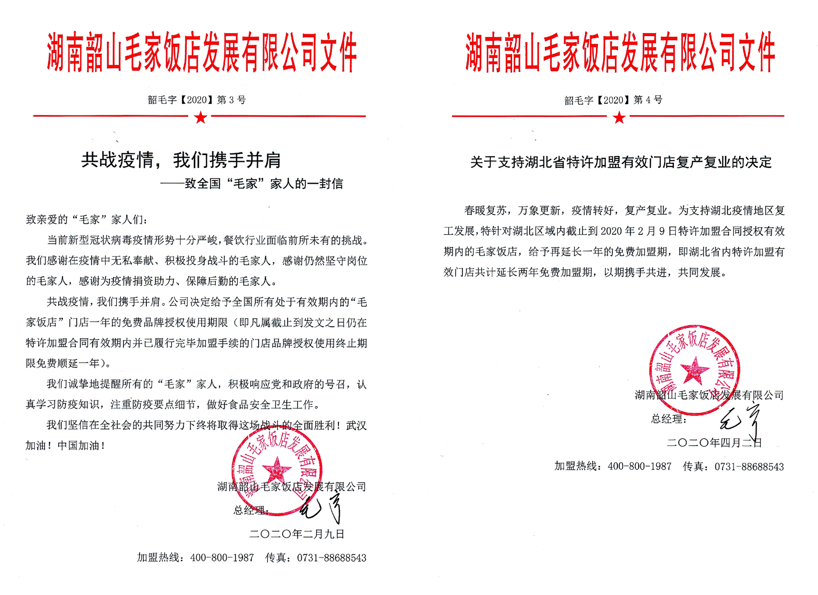 首先就是毛家飯店的擔(dān)當(dāng),把湖南的精神“敢為人先、勇于擔(dān)當(dāng)”發(fā)揮到了極致。2020年2月9日,湖南韶山毛家飯店發(fā)展有限公司率先決定,給予全國所有處于有效期內(nèi)的“毛家飯店”門店一年的免費(fèi)品牌授權(quán)使用期限;4月2日,公司再次決定為支持湖北地區(qū)復(fù)工發(fā)展,特針對湖北地區(qū)店面給予再延長一年的免費(fèi)加盟期,攜手并肩,毛家人一起共渡難關(guān)。