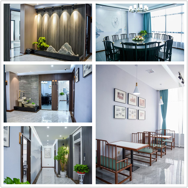 該店位于湖北省咸寧市通山縣田園路,面積650㎡,踏進門庭,古色古香的國風元素就迎面而來,大氣簡潔,靜雅脫俗,整體灰色的色調(diào)為整家店蒙上了神秘的面紗,墻上的壁畫與餐廳整體很是融合,綠色植物在灰色中跳脫出來。除此之外,店內(nèi)還設(shè)立了13個獨立包廂,幽靜典雅的裝修,親朋好友聚會最合適不過了!