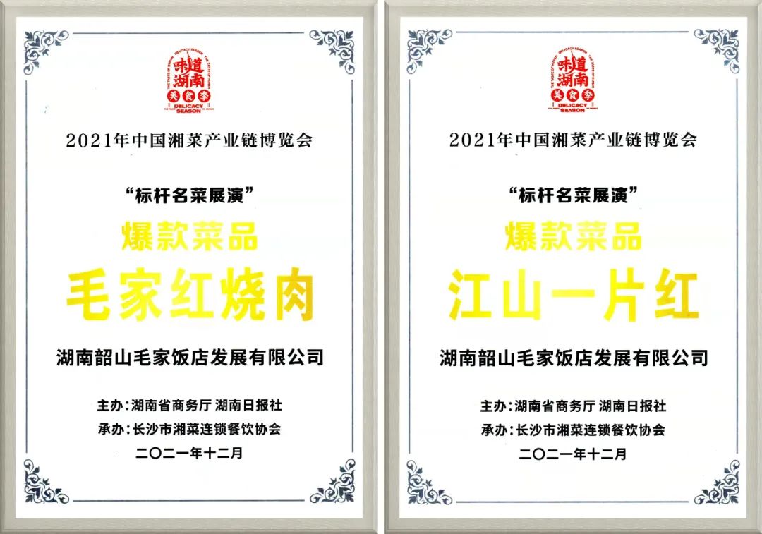 就在前不久的“中國湘菜產(chǎn)業(yè)鏈博覽會”標桿名菜展演中,『毛家飯店』的毛家紅燒肉、江山一片紅榮登“爆款菜品榜”。