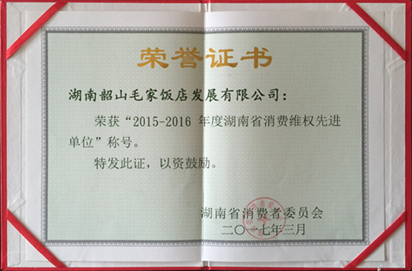 湖南韶山毛家飯店發(fā)展有限公司榮幸的被評(píng)為“2015-2016年度湖南省消費(fèi)維權(quán)先進(jìn)單位”并受到表彰。